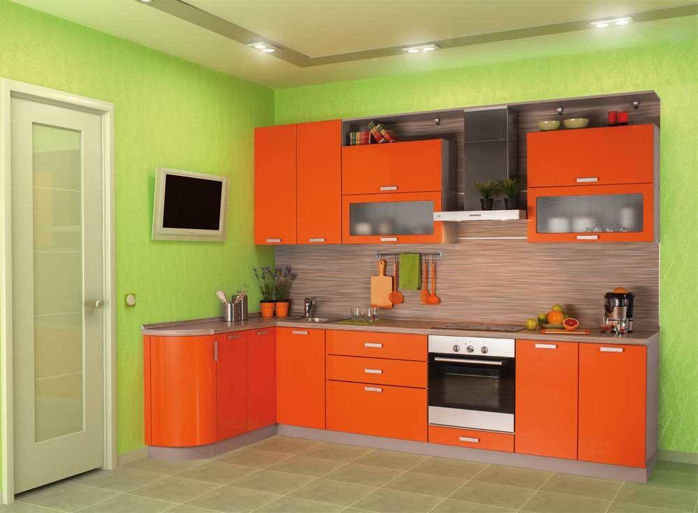 Дизайн кухни должен содержать яркие акценты и сдерживающие элементы. Популярным вариантом такого сочетания является дополнение оранжевого кухонного гарнитура салатовым фартуком, или наоборот.