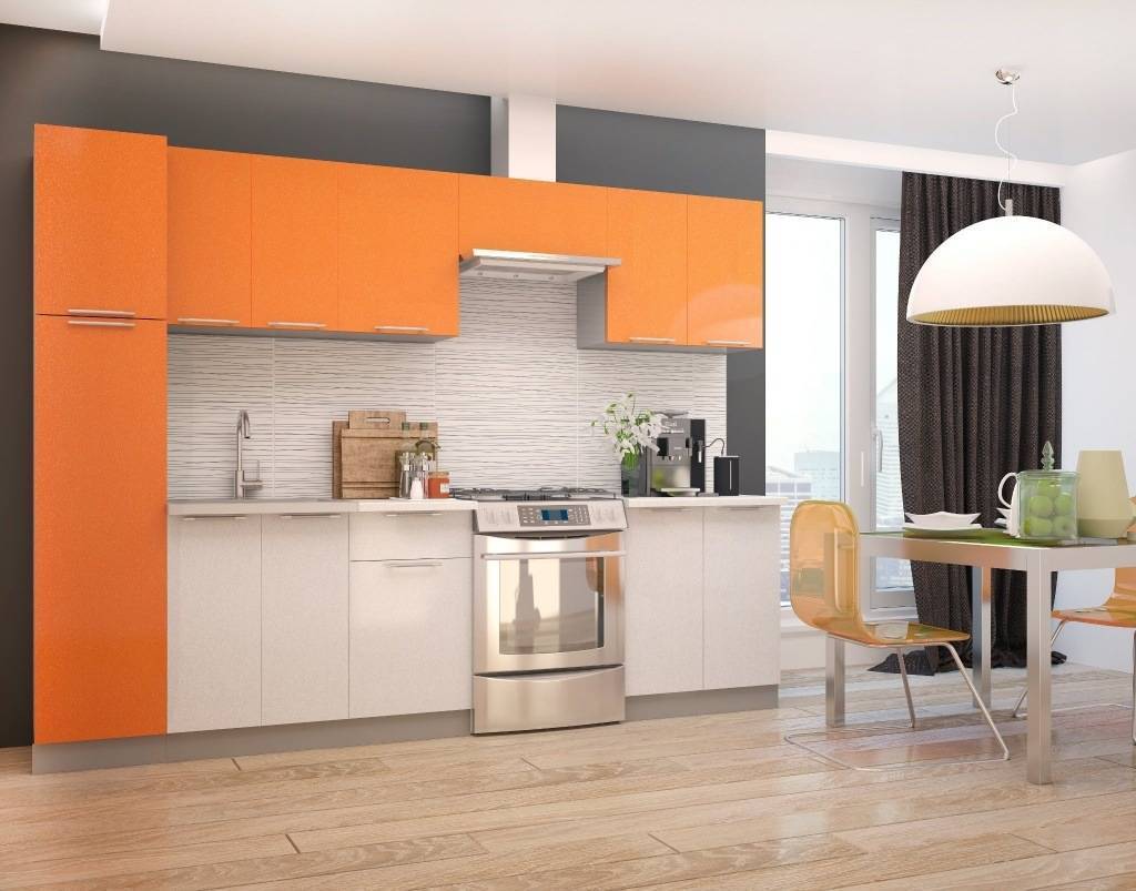 Идеальный вариант интерьера: стены декорировать серой штукатуркой, установить кухонный гарнитур светло-серого цвета с оранжевыми глянцевыми фасадами. Обустроить кухонный фартук с помощью мозаики черного, оранжевого и серого тонов. Поставить стол и стулья с металлическими основаниями и яркой оранжевой верхней частью.