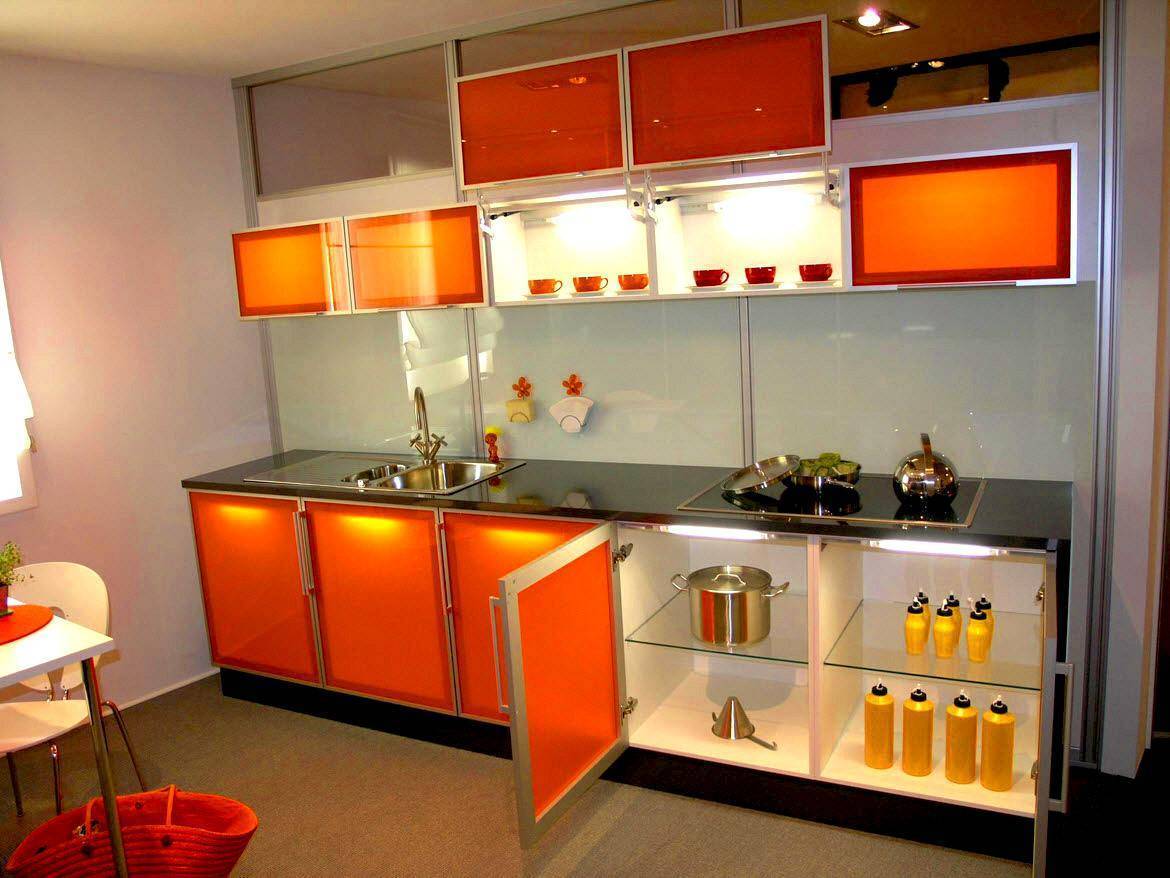 На кухне в стиле хай-тек можно установить лаконичный кухонный гарнитур с оранжевыми глянцевыми фасадами и стеклянными вставками. Стены в данном интерьере могут быть белыми или светло-серыми, в таком же цвете стоит обустроить и пол.