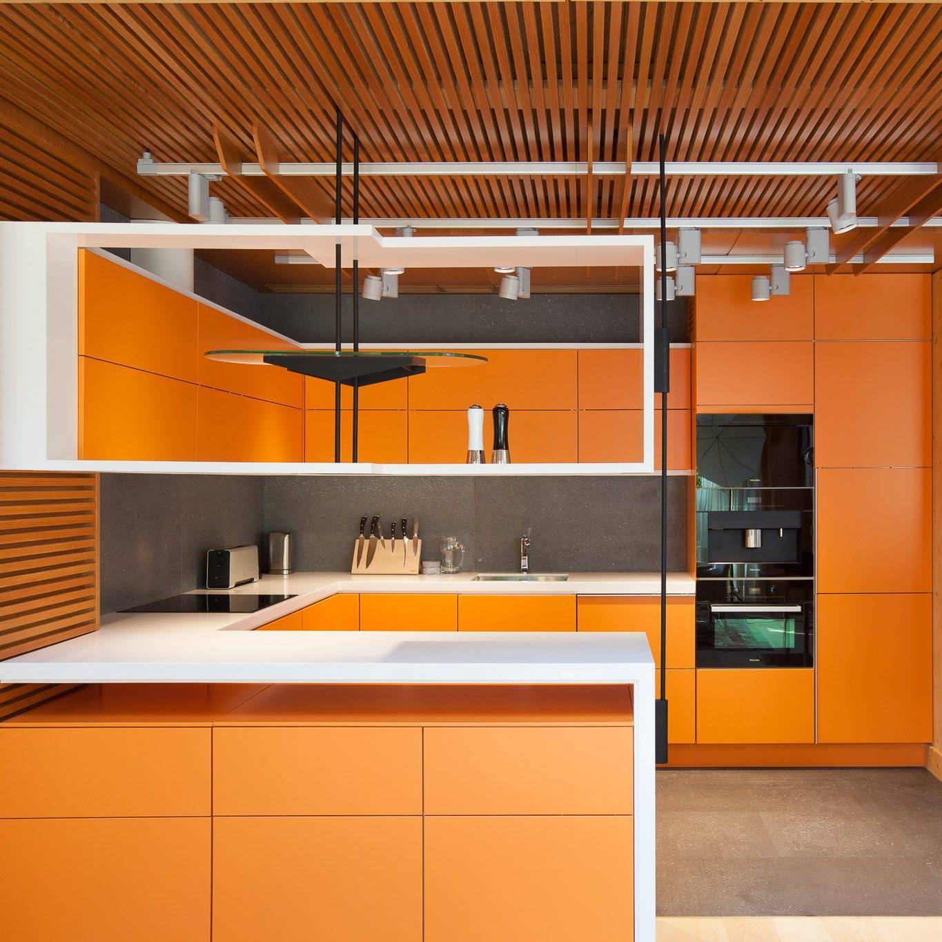 Интерьер кухни с оранжевыми верхними шкафчиками и подвесным потолком