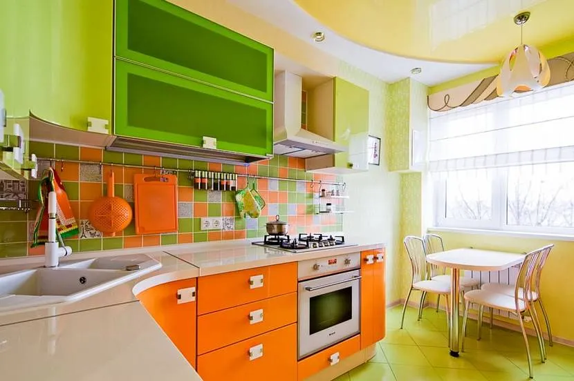 Помещение небольшой площади загромождать яркими цветами не стоит. Лучше использовать прием доминанты на фоне пастельных оттенков. Например, сделать акцент на ярком оранжевом кухонном гарнитуре и дополнить его элементами спокойных оттенков зеленого.