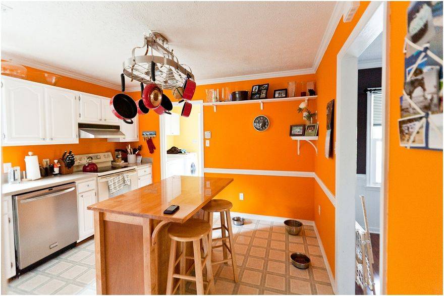 На большой кухне можно позволить себе использовать яркий оранжевый цвет более широко: оранжевый гарнитур, оранжевая мебель в обеденной зоне, оранжевый текстиль и детали декора. Стены в этом случае окрашиваются в светлые спокойные тона, близкие к оранжевому, но не являющиеся его оттенками: в сливочный, кремовый, светло-коричневый. Или в холодные тона: светло-серый, бледно-голубой.