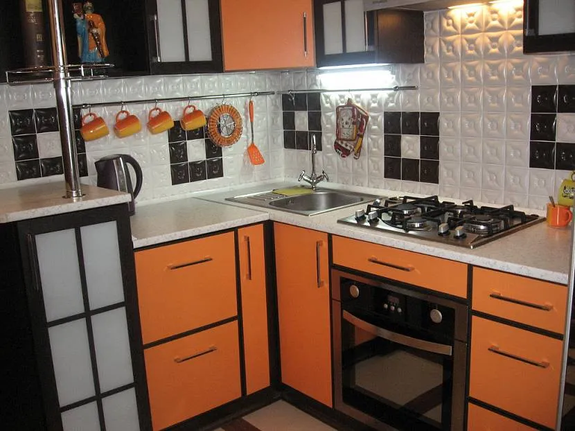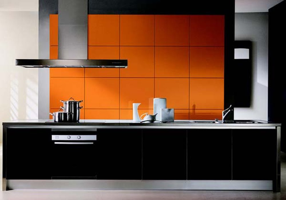 Например, оформить потолок и стены в черный цвет. Допускается даже использование экстравагантного глянцевого натяжного потолка. Кухонный гарнитур выполнить из акриловых или пластиковых фасадов черного и оранжевого цветов, а стены выполнить в светлых оттенках. Такая кухня не будет казаться загроможденной, а дизайн получится стильным и лаконичным.