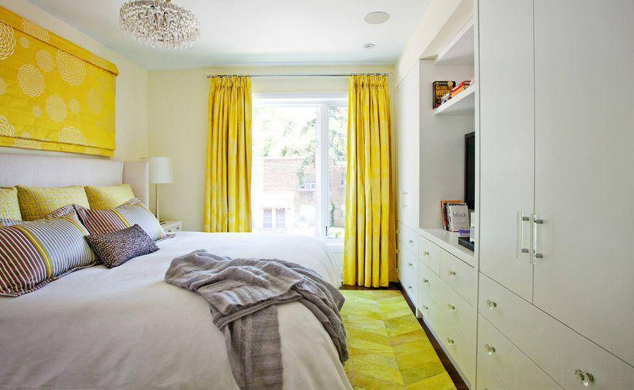 Желтые обои в спальне шикарно будут сочетаться со светлыми или коричневыми шторами, а также белой мебелью (как на фото выше). Дополнить интерьер спальни в этом цвете помогут небольшие светлые напольные вазы или картины в простых резных рамках на стенах.