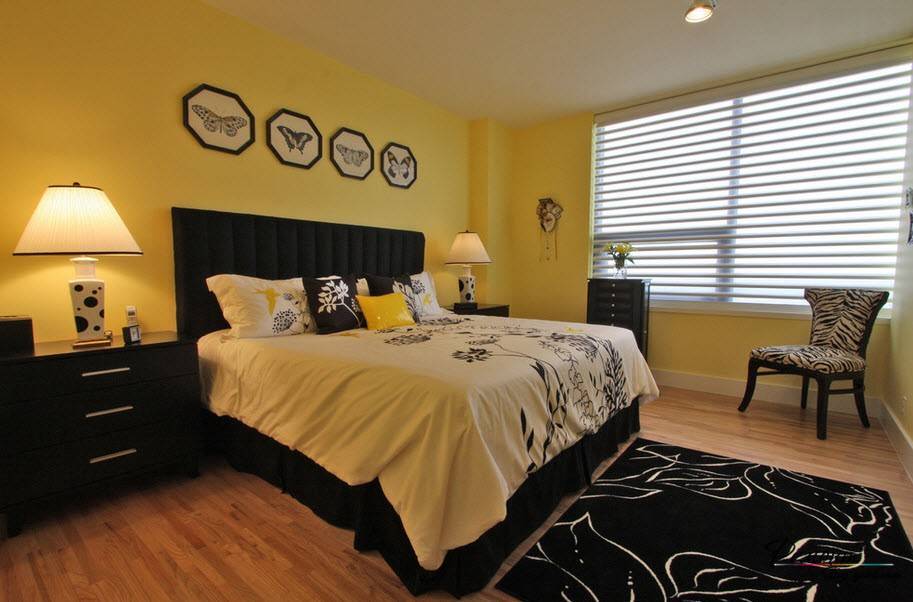 Смелым и необычным решением станет оформление спальни в желтых оттенках в сочетании с черным. Слишком много черного использовать в дизайне не стоит. Он будет хорош в виде небольших графичных элементов на желтом фоне. Например, можно использовать черные рамочки для фото. Дополнительно, в качестве нейтрального цвета, можно добавить белый или серебристый.