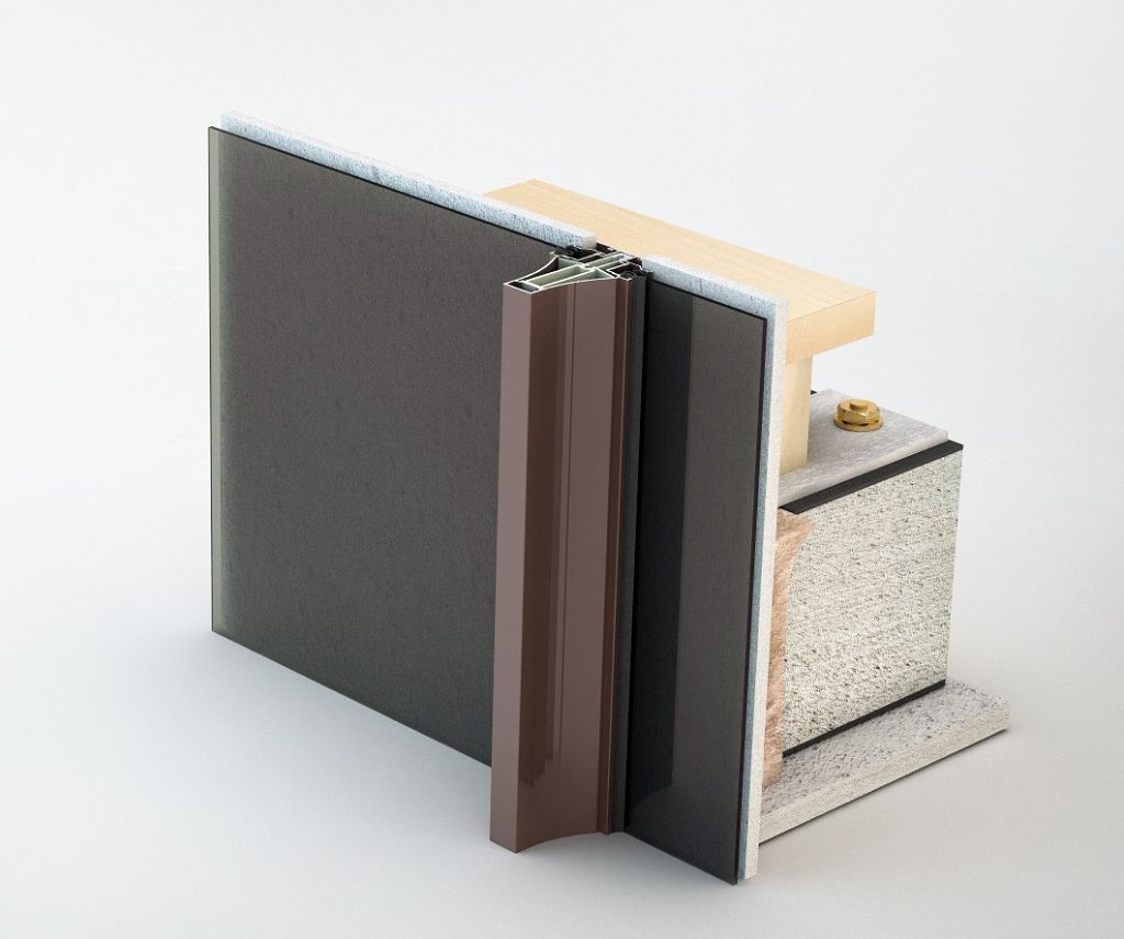 конструктивно схож с полуструктурным типом фасада. Основное отличие от последнего — способ крепления стеклопакета. Стекло крепится не на специальный металлический элемент, а при помощи специального герметика. По своим прочностным характеристикам он ни в чем не уступает полуструктурному фасаду, а в эстетике — существенно выигрывает.