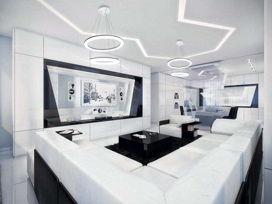 Стильно и современно смотрится подсветка из линий, которые могут освещать только потолок или переходить на стены.
