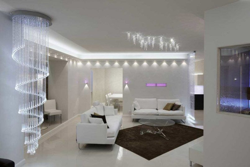 Хрустальная люстра будет отлично смотреться в большой комнате – как в современном, так и в классическом интерьере. Преломляя свет и «играя» с цветными бликами на стенах и потолке, люстра будет выполнять еще и декоративную функцию – как вечером, так и днем. Однако можно обойтись точечными светильниками на потолке. Разместить их нужно будет через 80 см (над необходимыми зонами).