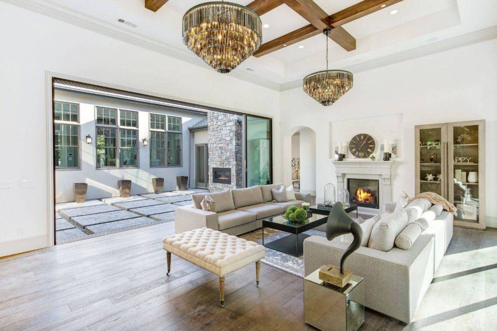 С помощью грамотно подобранного освещения расставляются яркие акценты на нужных деталях, и выполняется зонирование помещения. Особенно это актуально для гостиных, совмещенных с кухней. В отдельной статье, вы можете почитать подробнее о люстрах для кухни и о каминах в современном стиле.