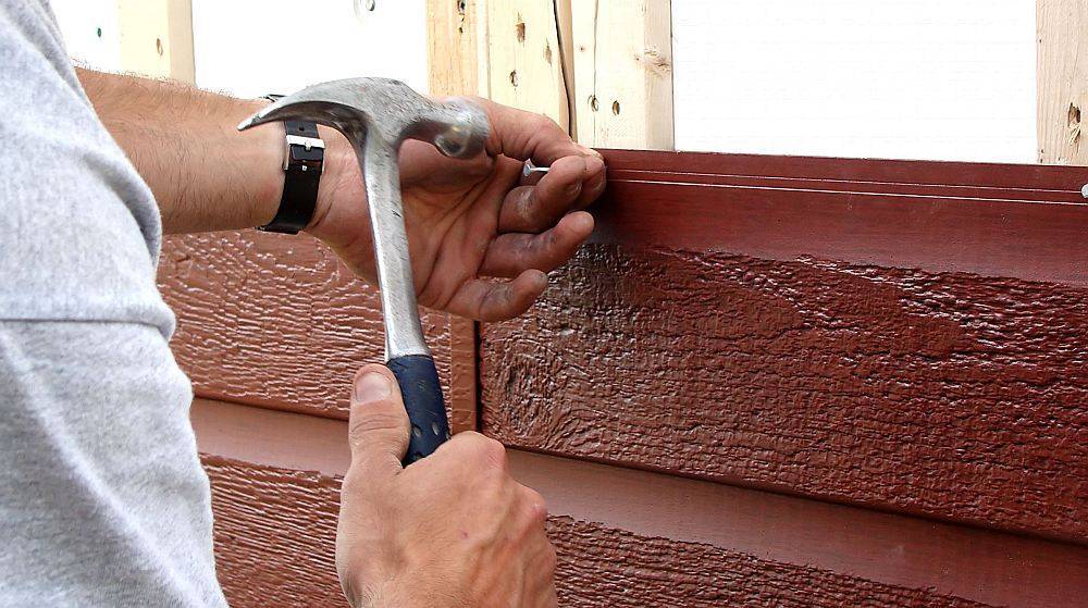 - Монтаж панелей. Нижнюю панель вставляют в стартовую полосу и защелкивают замки. В пазах с обеих сторон должен оставаться зазор 3-4 мм. Верхнюю часть панели фиксируют к обрешетке саморезами. Затем в нее вставляют следующее полотно, соединяя их между собой замком. Для крепления к обрешетке используют саморезы.