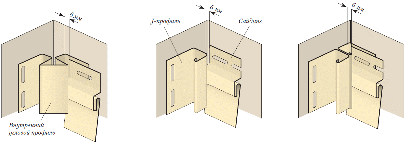 - Соединение сайдинга внахлест. Края напускают на соседние панели справа или слева. От стенок комплектующих деталей и между верхними замками оставляют рабочий зазор 6-12 мм.