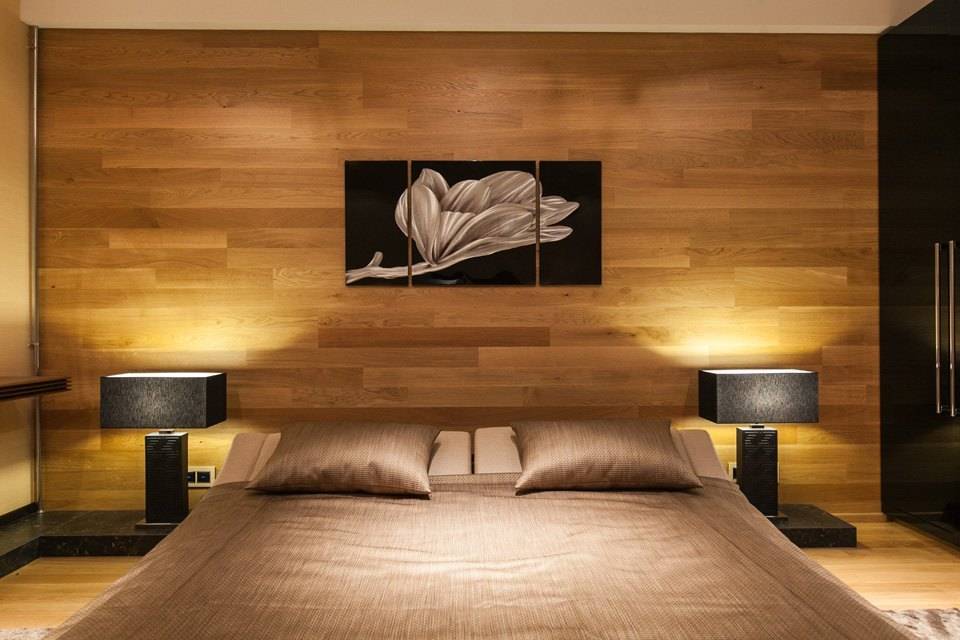 Таким образом можно декорировать всю стену, а можно создать облицовку, идущую только по ширине кровати до самого потолка. Считается, что натуральное дерево способно улучшать сон. В современных стилях предпочтение отдается асимметрии.