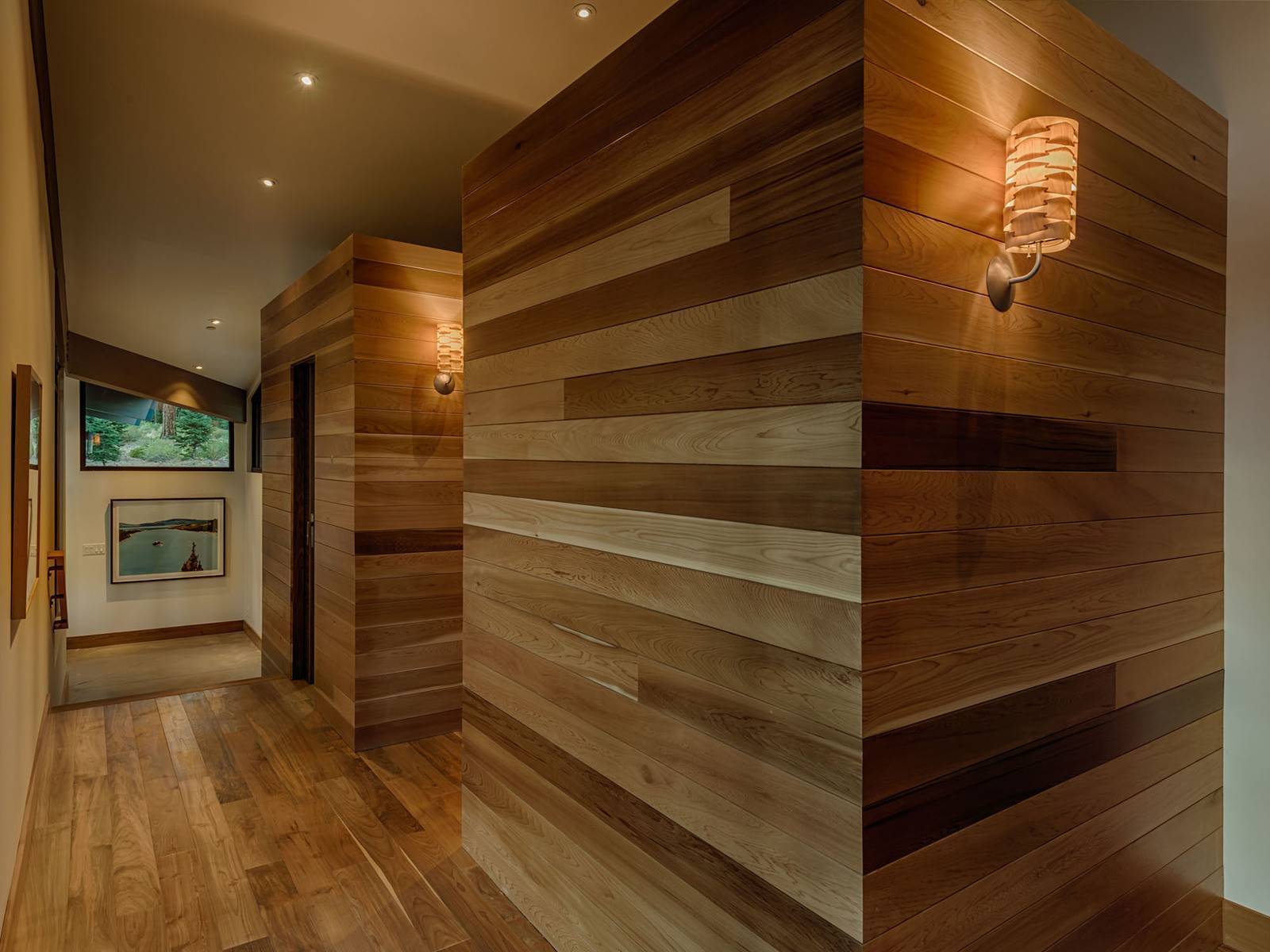 Даже участок стены из торцов способен приковать взгляд. Отделанные деревянными панелями стены произошли из того, что переработанные отходы некоторых других продуктов стали одним из самых популярных настенных покрытий, а конкретно этими отходами были торцы и спилы. При внимательном рассмотрении каждого такого настенного блока выявляются ростовые кольца и варианты коры дерева с индивидуальной росписью.