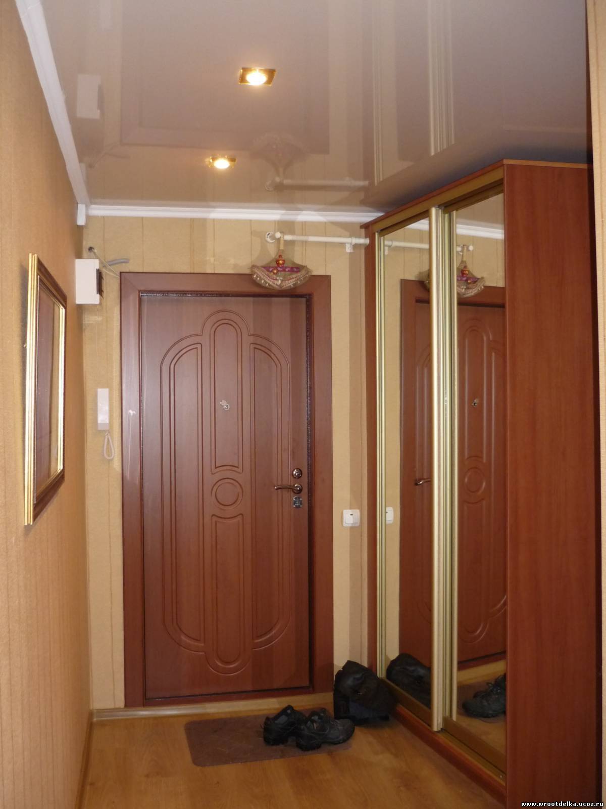Весьма примечательный вариант ремонта небольшой прихожей, выполненный в несколько поднадоевшем уже, но все еще актуальном бежево-коричневом цвете. Особой художественной подготовки не нужно чтобы отметить удачное сочетание мебельного гарнитура, форм-фактора двери, тона напольной плитки и глянцевых натяжных потолков.Это не интерьер мечты, о нет, но смотрится для хрущевки более чем прилично!
