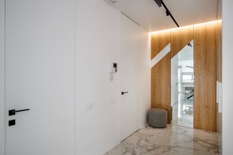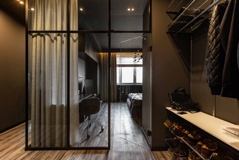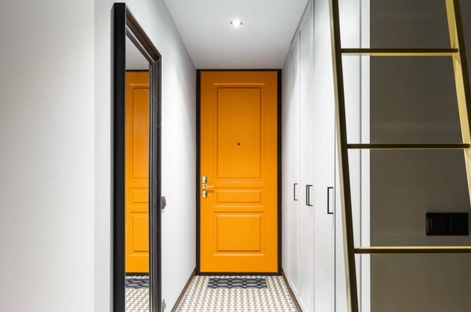 Еще один аспект, затрудняющий работу над декором коридора, – выходящие в него двери. Кроме того, что это мешает в полном объеме эксплуатировать пространство стен, они еще и съедают львиную долю этого пресловутого и дефицитного пространства. Движение по такому коридору напоминает фристайл, потому что нужно постоянно лавировать между дверными створками. Избавляться от этой проблемы нужно обязательно, так что сразу же планируйте себе замену привычных нам дверных полотен на складные конструкции или раздвижные варианты. Если двери в какую-то комнату можно просто снять, то сделайте это и оформите проем в арочном варианте.