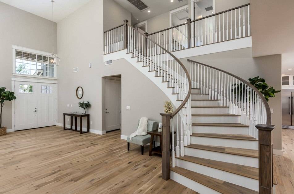 При отсутствии чрезмерной нагрузки на полы можно покрывать их менее прочной отделкой. Неплохим вариантом в интерьере такого коридора станет паркет, естественно, дубовый. Его ламели будут устойчивы к истиранию, потому что древесина дуба невероятно прочна. Выглядеть коридор с таким полом будет шикарно.
