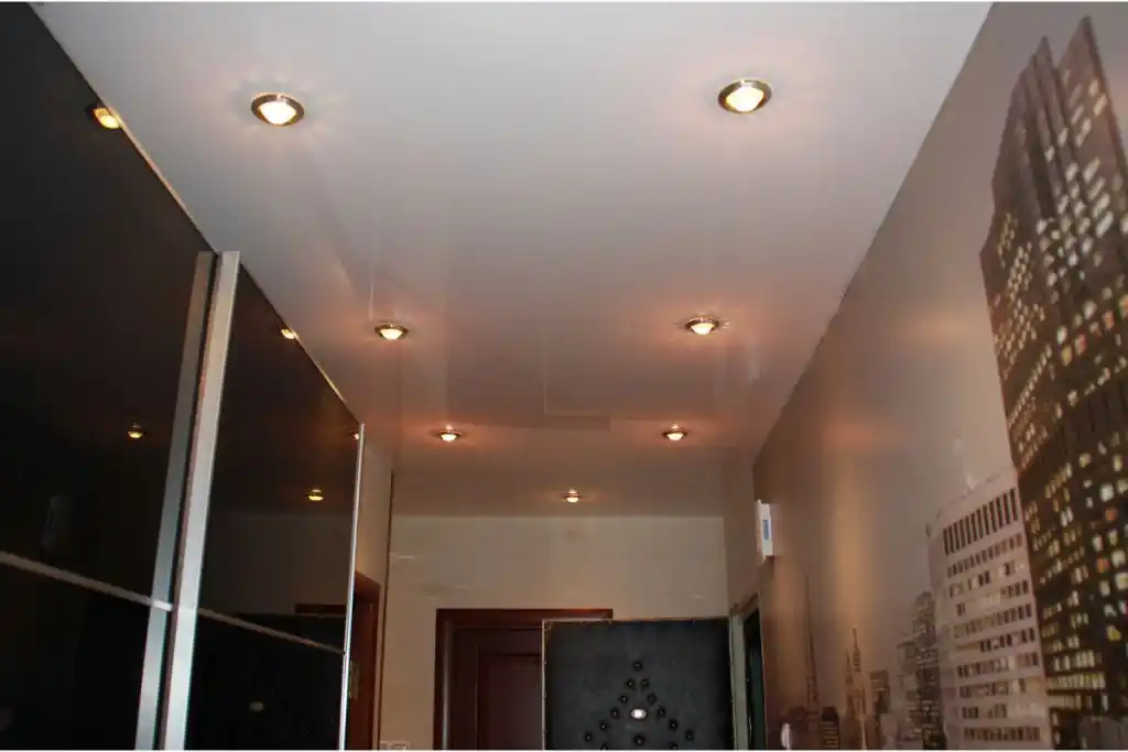 Могут в интерьере коридора использоваться подвесные потолочные конструкции или натяжная технология. Первый способ самый экономичный, однако, срок службы побеленного потолка недолог. Да и белить надо хорошо отштукатуренную и гладко прошпаклеванную поверхность. Для современного дизайна такой вариант не актуален, но при отсутствии возможности позволить себе нечто более практичное в декоре потолка, может стать оптимальным.