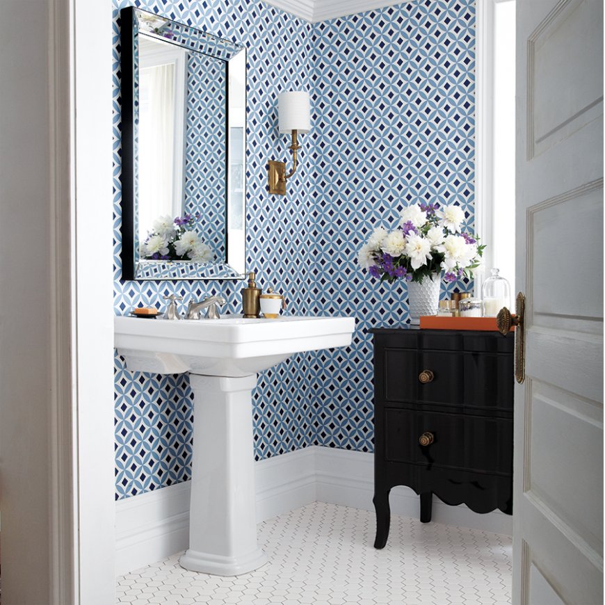 Чтобы подчеркнуть насыщенность краски, узор на цветных обоях должен быть на несколько тонов светлее. Такой подход придаст ванной комнате элегантный вид.