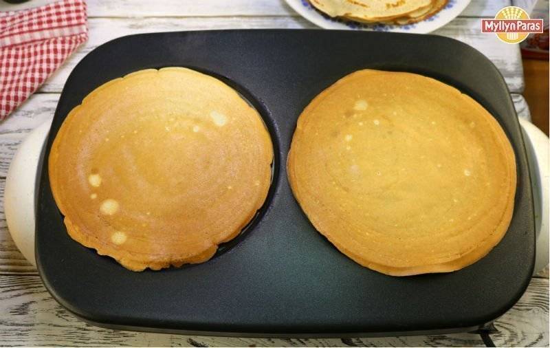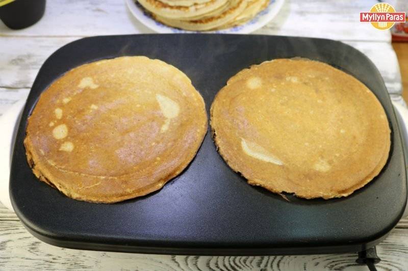 Резюме: такие блины напоминают классические: румяные, легко переворачиваются. Отличия в том, что на вкус они суховаты, мало воздушности.