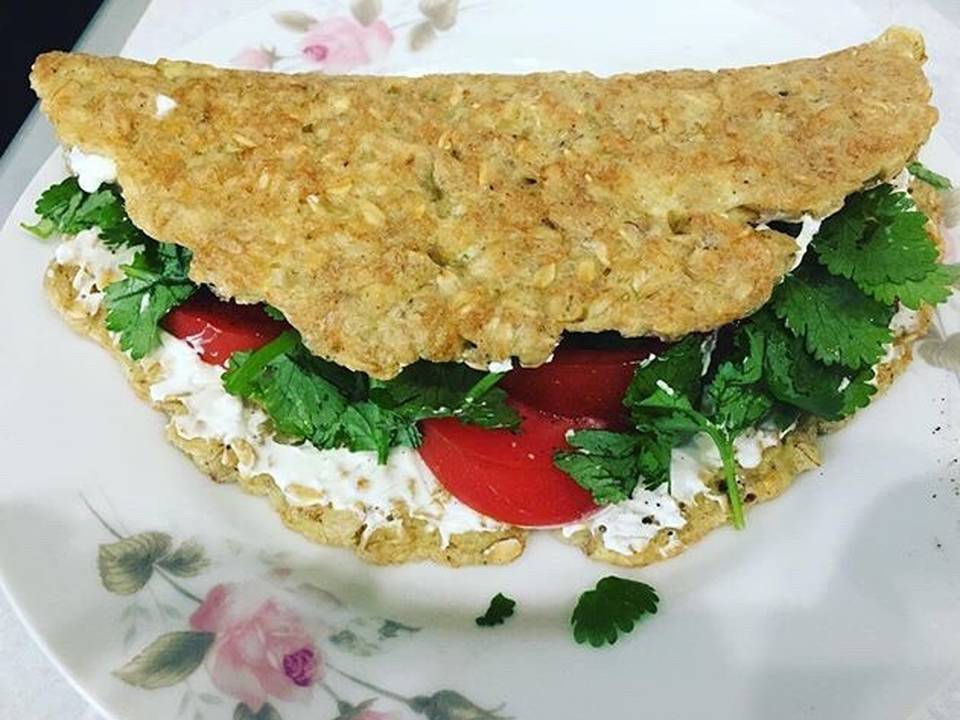 - В творог при желании можно добавить рубленную зелень или специи. Разрезаем овсяноблин на две части и смазываем одну часть творогом. Накрываем второй частью и получается самый настоящий диетический сэндвич.