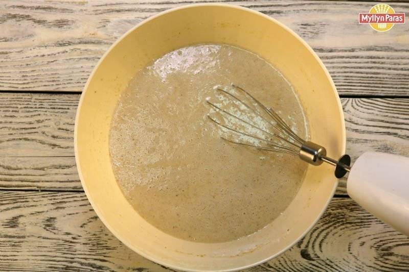Добавляем в сухую смесь яйца и молоко, затем энергично смешиваем блендером. Даем настояться 30 минут, после вливаем в тесто растительное масло.