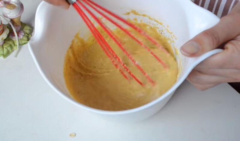 Все ингредиенты, которые мы добавили в емкость, взбиваем блендером или ручным венчиком до однородной массы. Должна получиться жидкая эмульсия. Даем ей настояться в течение десяти-пятнадцати минут.
