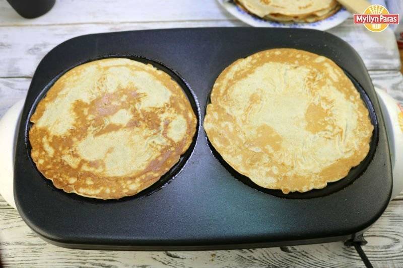 Ставим на огонь сковороду (блинницу), смазываем разогретую сковороду растительным маслом, распределяем тесто тонким слоем и выпекаем.