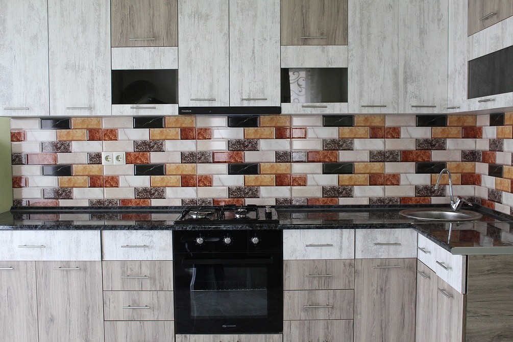 - Имеют вид плитки. Их выпускают в форме квадратов или прямоугольников, с различной длиной стороны. Плитка для стеновой панели для кухни выступает в основном заменителем аналога из керамики.