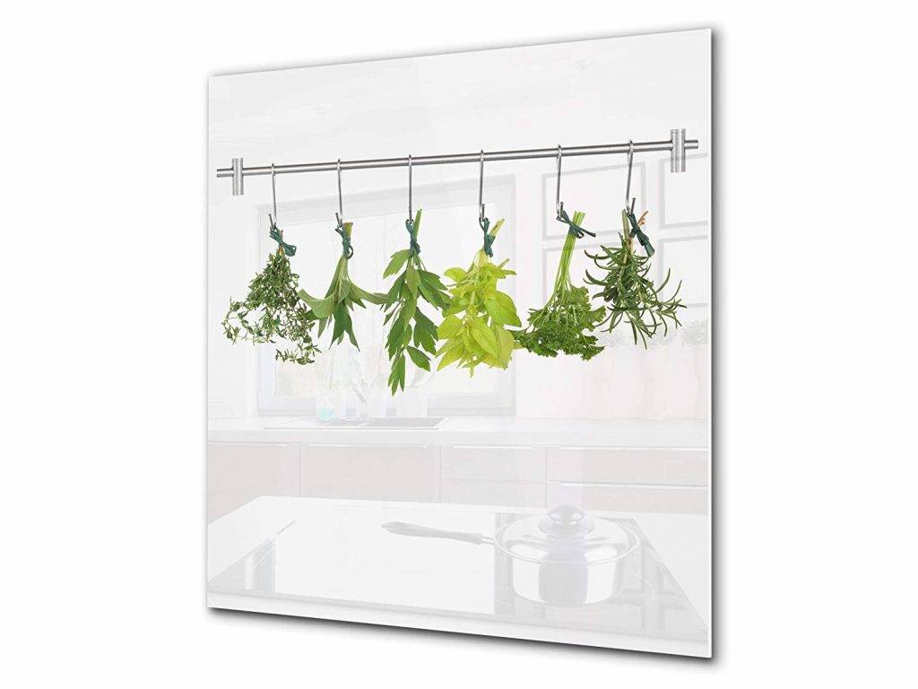 Стеклянные панели еще называют скинали. При выборе материала необходимо ориентироваться на температурные ограничения и не устанавливать над плитой материал с низким уровнем жаростойкости.