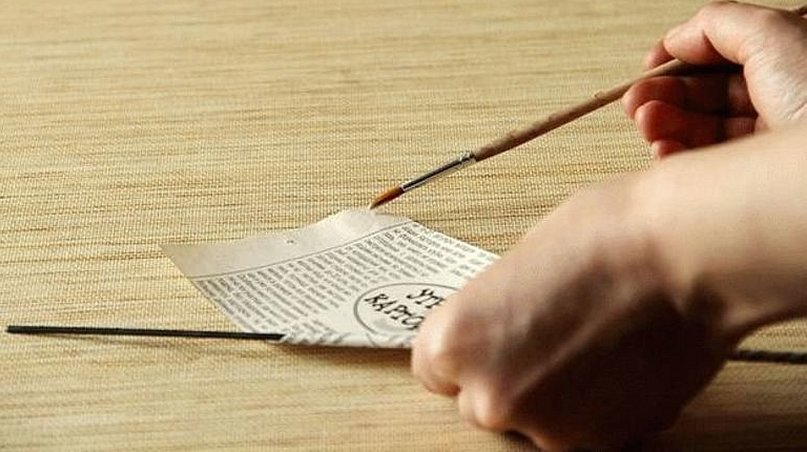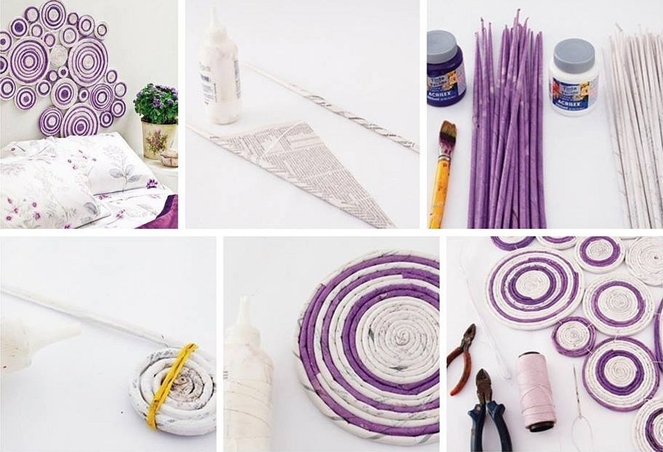 Прежде чем смастерить панно из газетных трубочек, нужно сделать заготовки. Для этого газетный лист разрезается на 4 части. Каждая часть накручивается на металлическую спицу или деревянную шпажку, которая кладется на лист под углом в 45°. Край трубочки закрепляется каплей клея, чтобы готовая деталь не распадалась. Скручивать необходимо таким образом, чтобы один край был толще. Это позволит при необходимости удлинять заготовки, вставляя одну трубочку в другую. Скручивать детали нужно плотно, чтобы они получались ровными и аккуратными. Вынимать спицу можно в тот момент, когда полоса прокручена наполовину. Количество заготовок будет зависеть от размеров будущего панно. К творческому процессу можно привлекать членов семьи, предварительно проведя для них мастер-класс по скручиванию газетных трубочек.