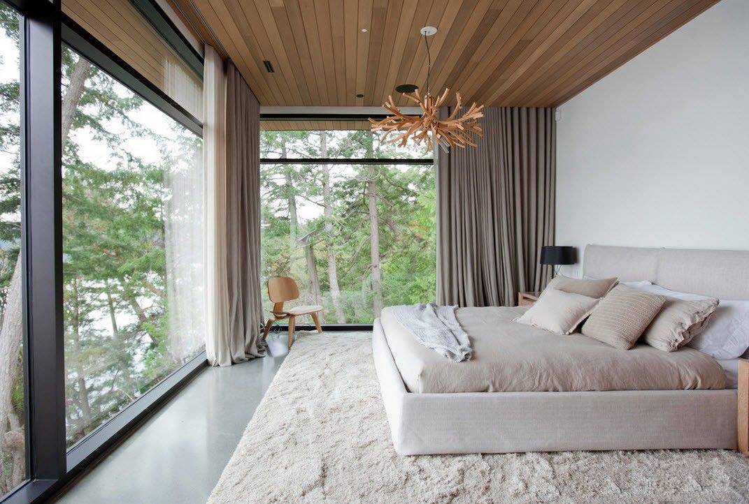 Панорамное остекление – благодатное поле для дизайнерской мысли. В случае бюджетного варианта, когда используются стекла без тонировки, первое, что предлагает дизайнер – это шторы: