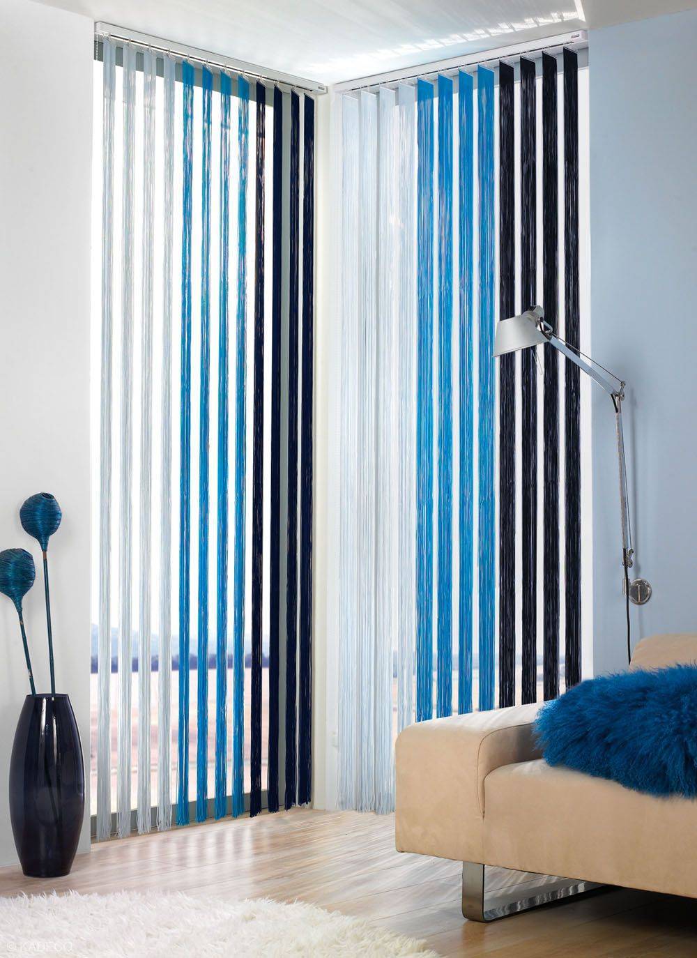 Нитяные жалюзи с эффектом драпировки. Их можно скомбинировать из разноцветных нитей и дополнительно украсить стразами или бусинами. Используя различные виды материала и регулируя размер нитяных штор, можно выгодно подчеркнуть любой стиль в общем оформлении панорамного балкона.