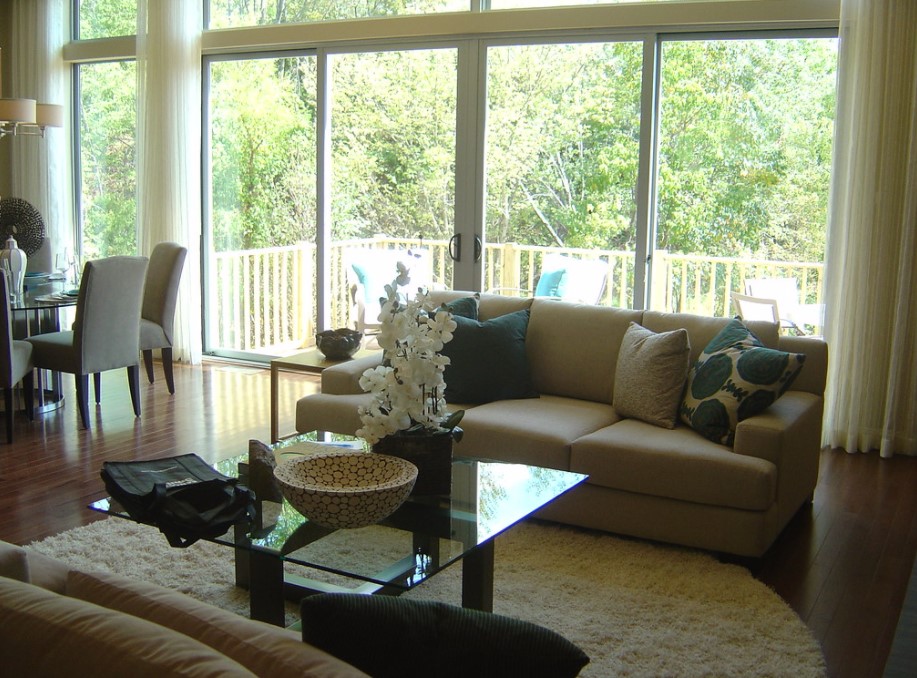В дизайн панорамных окон гармонично впишется созданный своими руками декор фонтана или водопада, при этом стена возле него отделывается искусственным камнем. Стекла требуют и особого подхода к мебели. Идеальными здесь станут легкие кушетки, складные столики, навесные полки, встроенные шкафы.