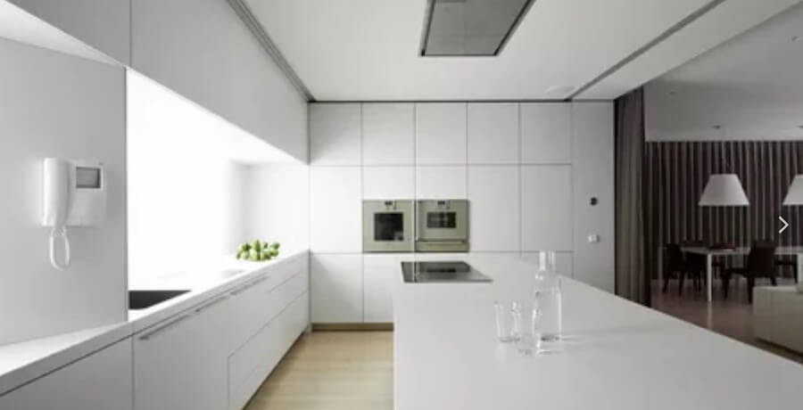 Подвесная мебель будто создана для воплощения этого стиля: простые линии, минимум декора и большое количество свободного пространства. При воссоздании минимализма желательно выбирать монохромную палитру для парящего гарнитура. В этом случае кухня будет смотреться лаконично и оригинально.