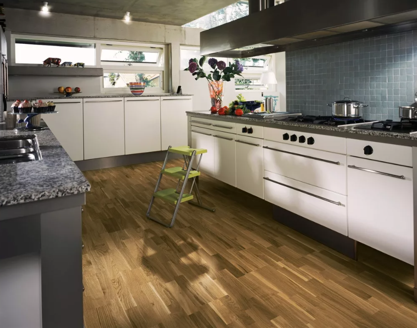 Паркетная доска по конструкции идентична доске инженерной. Главное отличие в том, что паркет укладывают на подложку плавающим методом, а инженерную доску садят на клей. Разделяют эти материалы на два вида только в России. В других странах оба покрытия просто называют инженерные полы — Engineered Floors. Само собой, и тот, и другой вариант подходит для укладки на кухне.