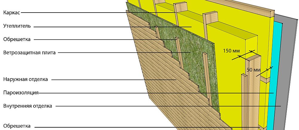 Пароизоляция каркасного дома выполняется практически по той же схеме, что и для других строений, но есть и свои отличия. Так, несущие конструкции не имеют функции утепления, и это существенная разница. «Пирог» стены выглядит следующим образом: