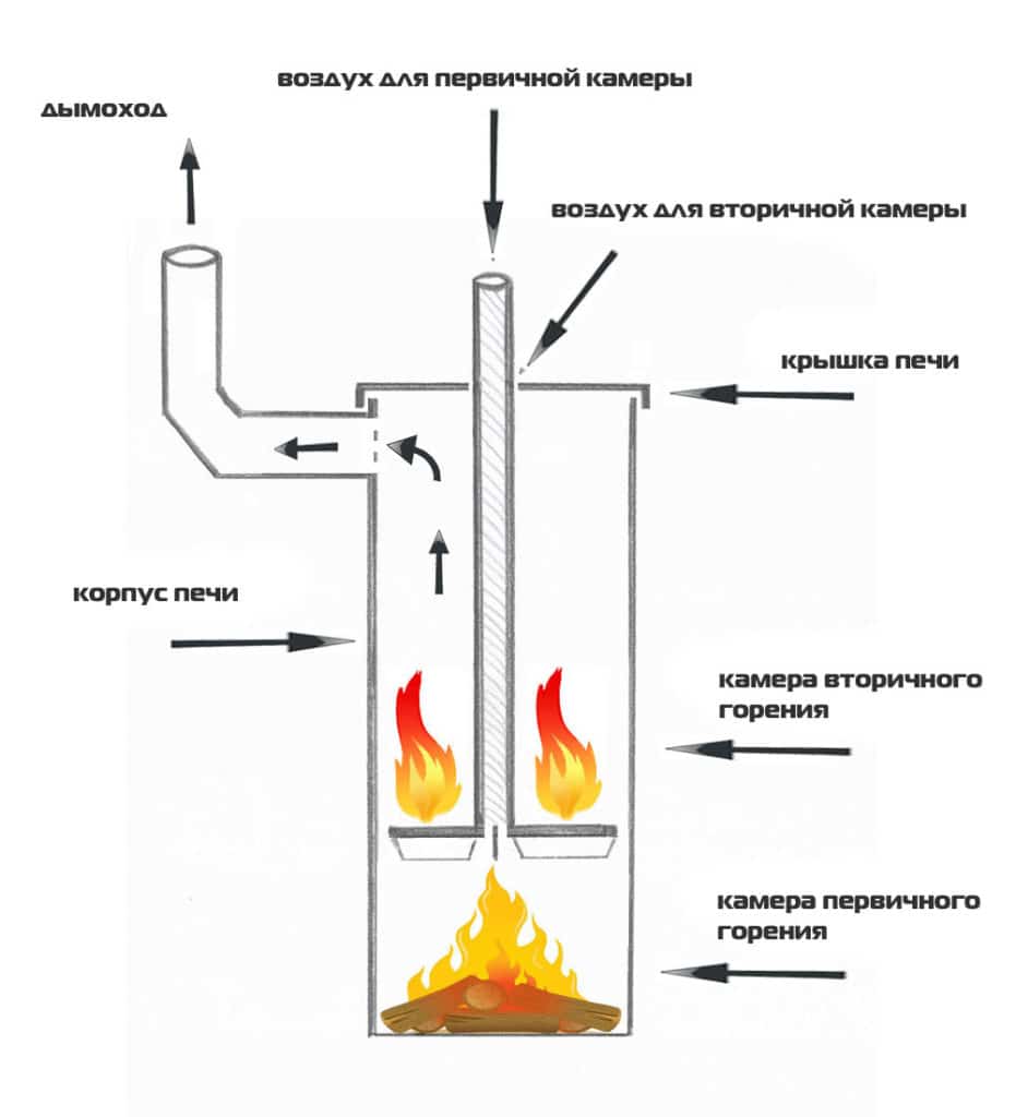В корпус загружается твердое топливо. Высота корпуса подбирается в диапазоне 3 – 5 диаметров цилиндрической части. Поршень (стальной круг со сквозным отверстием) закрывает топливо и разделяет внутренний объем на две зоны горения. Диаметр прижимного элемента составляет 0,95D, где D – внутренний диаметр топки. Толщина металла поршня имеет значения в зависимости от внутреннего диаметра печи: при 300 мм – 9 мм, 400 мм – 7 мм, 600 мм – 5 мм, 800 мм – 3 мм. В основной топке тлеет топливо, в верхней полой части цилиндра горит пиролизный газ. Через зону пиролизного сгорания по воздуховоду (стальной трубе) проходит воздух для процесса горения. Продукты процесса покидают топку через патрубок дымохода, присоединенный к дымовой трубе.