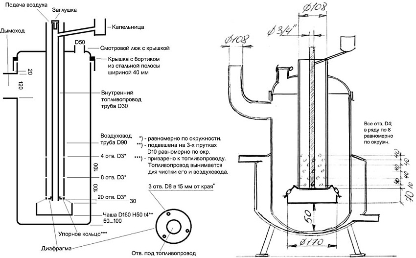 - Тем, кто планирует сжигать для отопления отработанные масла, рекомендуется сварить из круглой трубы печку капельного типа (вариант №4). При желании и умении можно провести ее модернизацию — переделать в котел, изготовив водяную рубашку.
