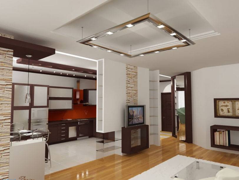 - Разноуровневые полы и потолки. Чаще всего кухню делают на 10-15 см выше зоны гостиной. Это позволяет спрятать под полом все коммуникации или сделать дополнительное место хранения. При устройстве многоуровневых потолков можно параллельно обыграть и световое оформление.