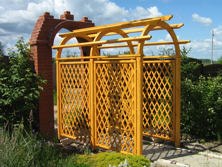 - Габариты дома и участка. На большой территории маленькая беседка или ширма потеряется. Слишком большая может не зарасти зеленью до конца.