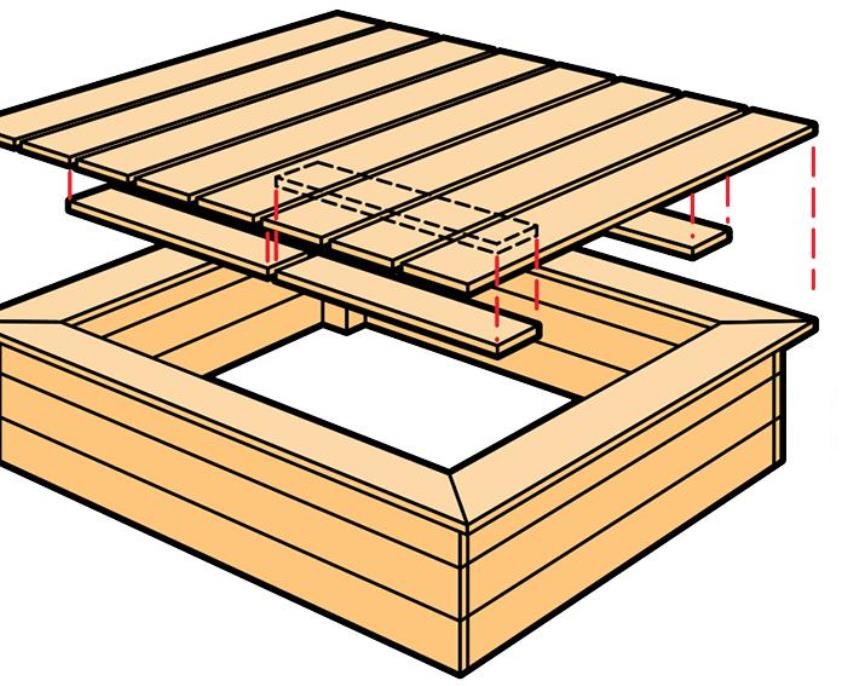 Детскую песочницу можно укрывать и тентом, но крышка из досок будет значительно удобней. Наибольшим удобством отличается крышка, образованная двумя щитами, крепящимися на шарнирных петлях и снабженных ручками. Такую крышку можно сконструировать так, чтобы она превращалась в удобную скамейку.
