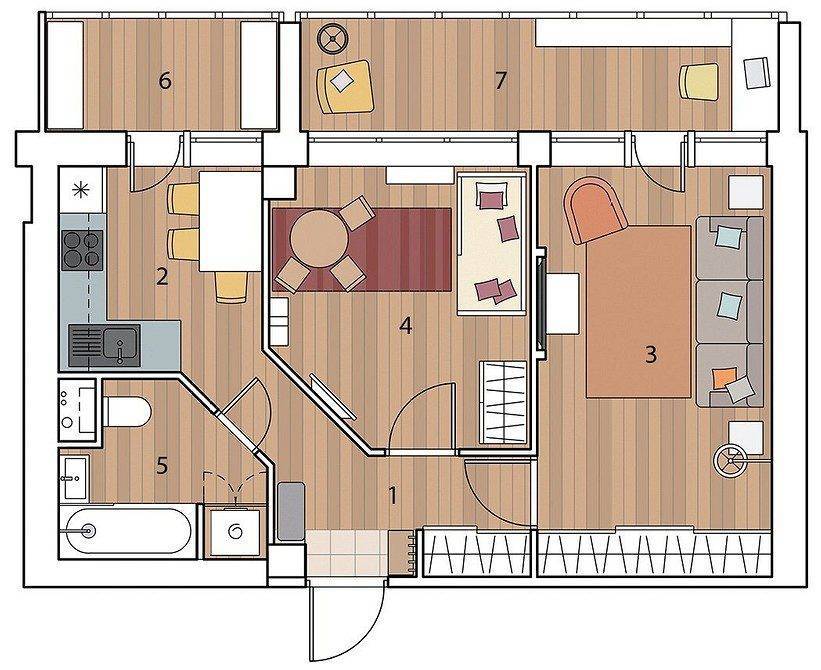 Изменить положение поможет демонтаж ванной, если на ее место установить функциональную душевую кабину и стиральную машину, которая занимает свободное пространство на кухне. Можно увеличить пространство, за счет объединения одной из комнат с балконом. Если это не нарушит фасад здания, проблем с утверждением в БТИ не будет. На балкон можно перенести бытовую технику с кухни или устроить там уютный уголок для чаепития или кабинет. Перед этим балкон утепляют и делают ремонт.
