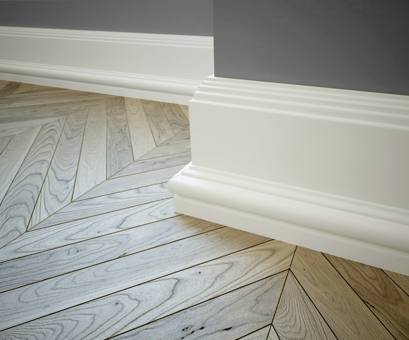 Для этого вида нужны идеальные стены. Как правило, выпускаются белые или темные дюрополимерные плинтусы (Orac Decor, Decomaster, NMC), но есть и варианты имитации текстуры дерева в разных оттенках, например, Arbiton Integra.