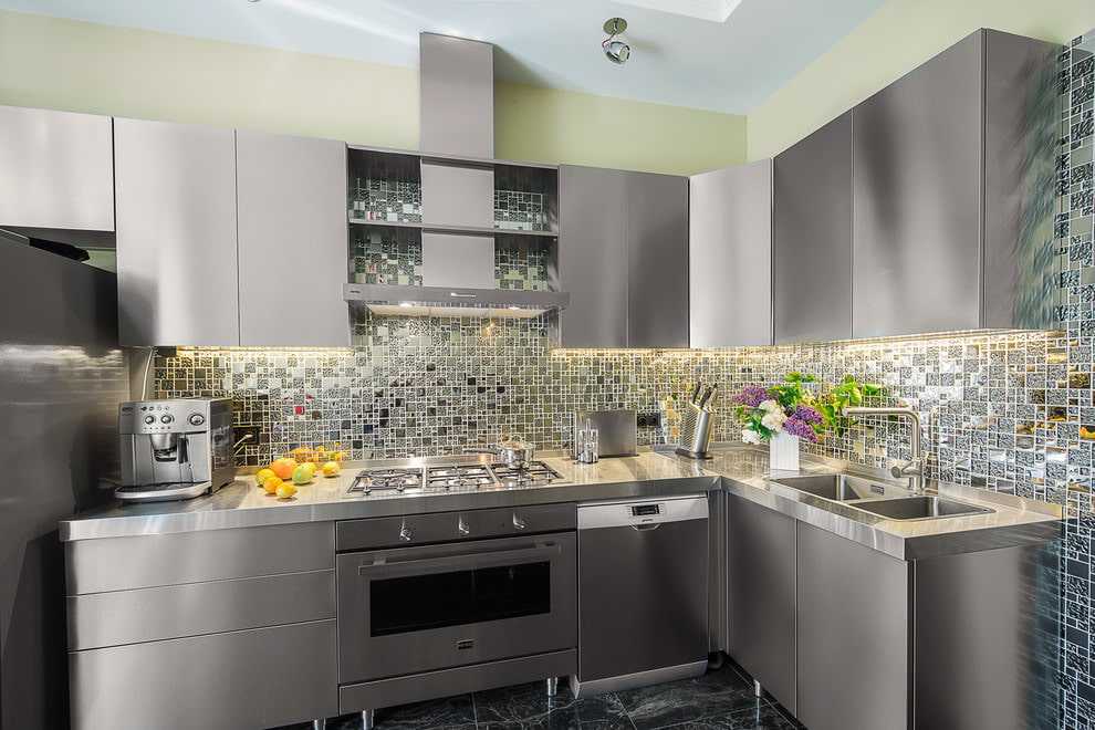 Металлический фартук прочен, не подвержен никаким агрессивным воздействиям, но имеет всего две фактуры — глянцевую и матовую. Он идеально подходит для кухонь в стиле минимализма или хай-тек. К сожалению, в других стилях он будет смотреться не совсем уместно.