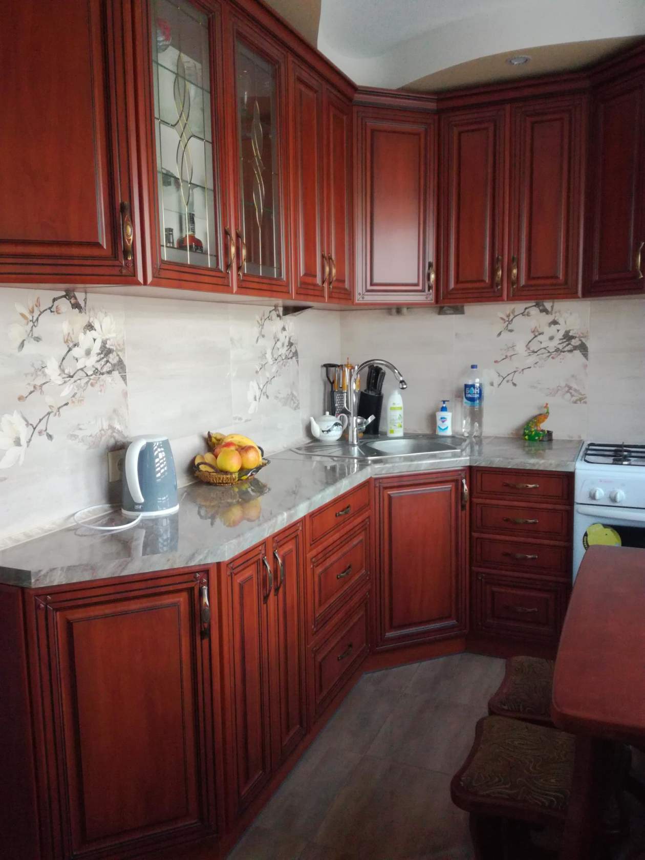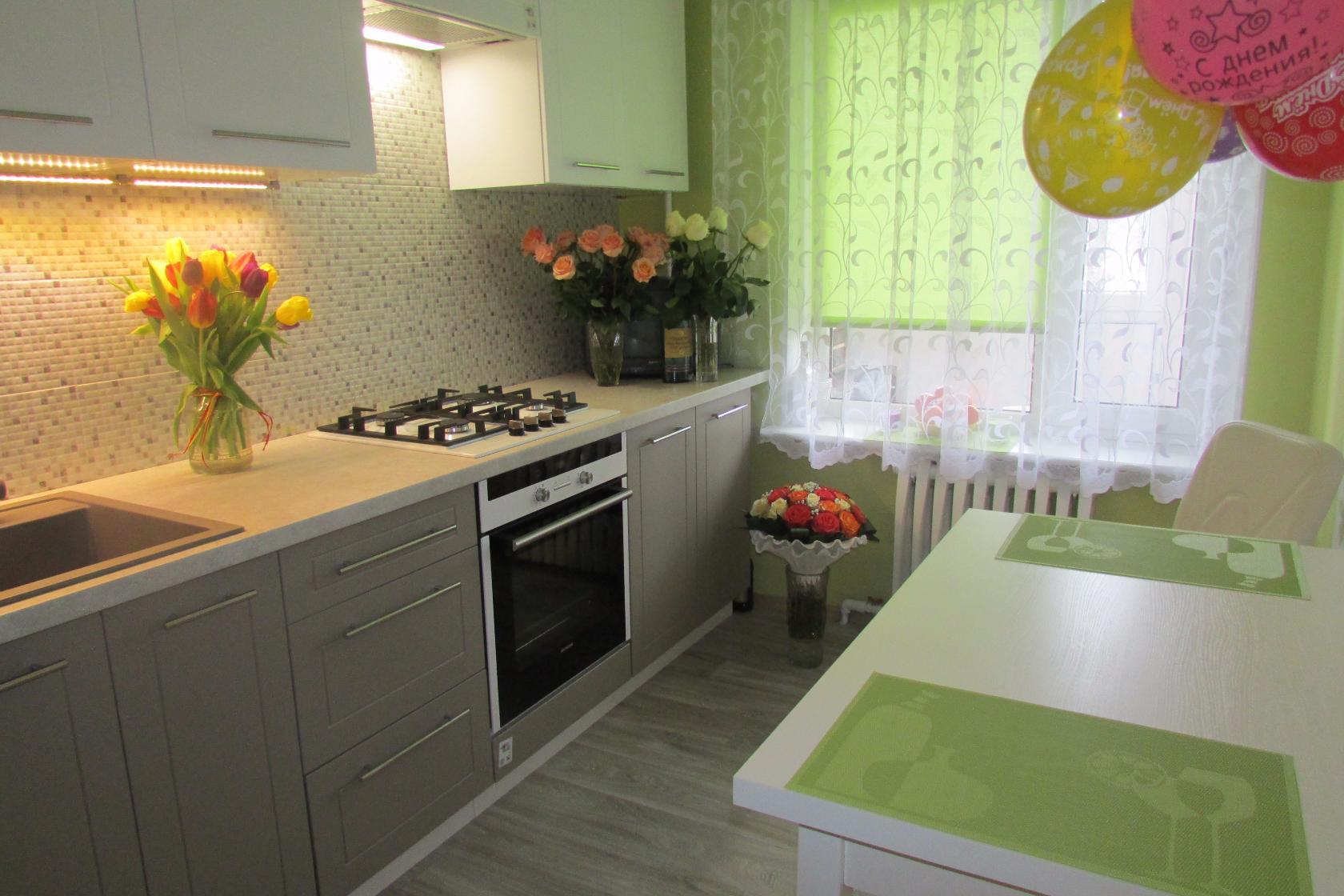 наиболее удачным вариантом будет плитка для пола, которая имеет тот же цвет, что и гарнитур или хотя бы нижняя его часть;