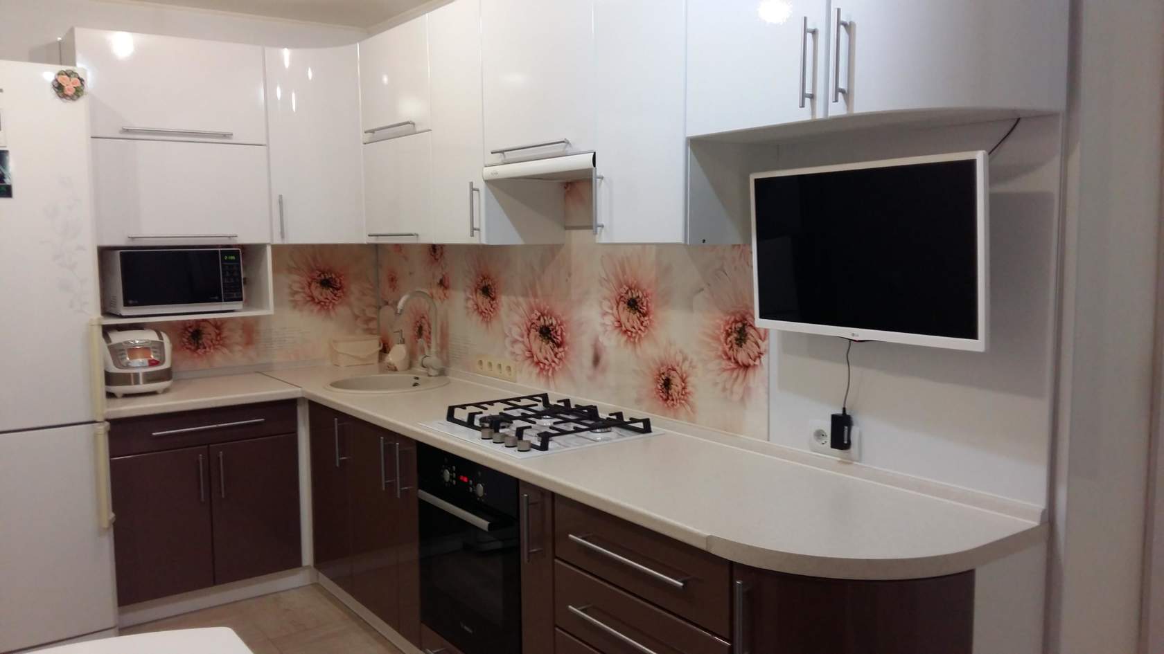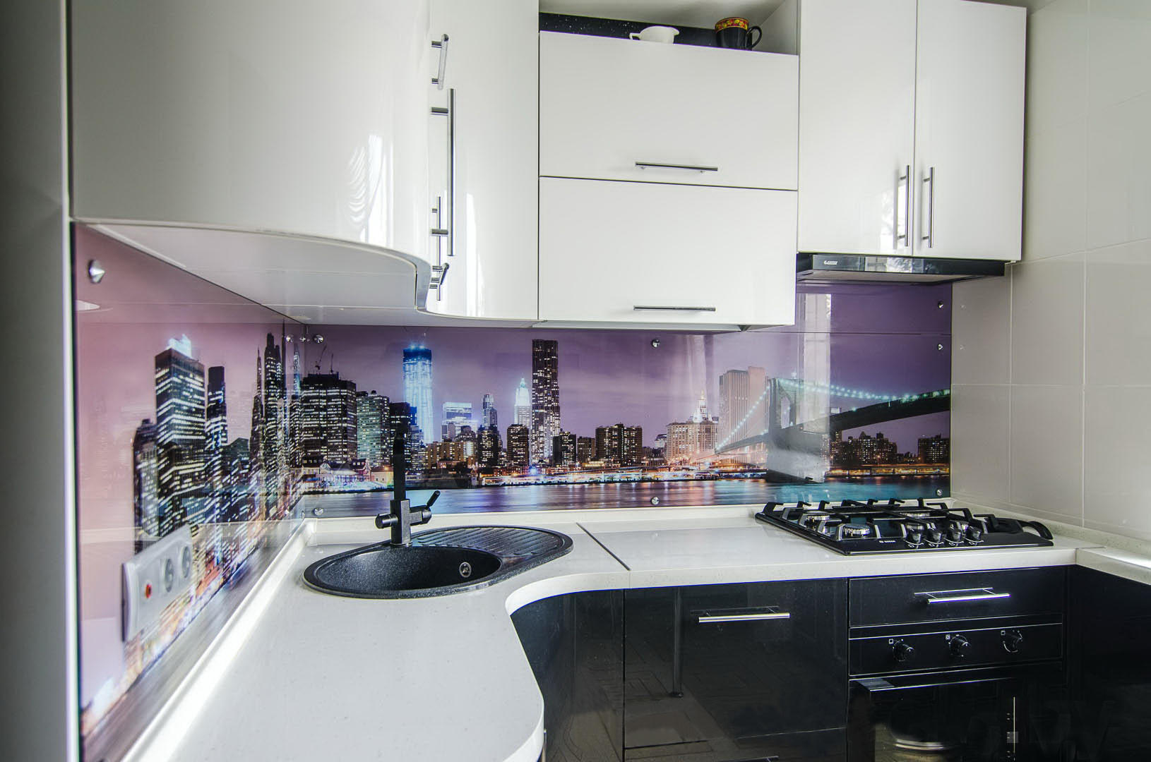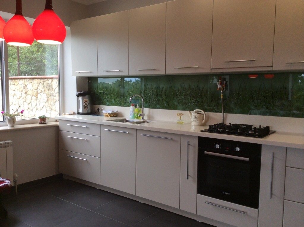 Стеклянный фартук удобен тем, что в интерьере его можно использовать не только в качестве просто прозрачного материала, который подчеркнет роскошную отделку настенных поверхностей, как на фото современной кухни с модным фартуком из каталога, но и сделать узор на стекле, тем самым делая дизайн кухни более интересным.