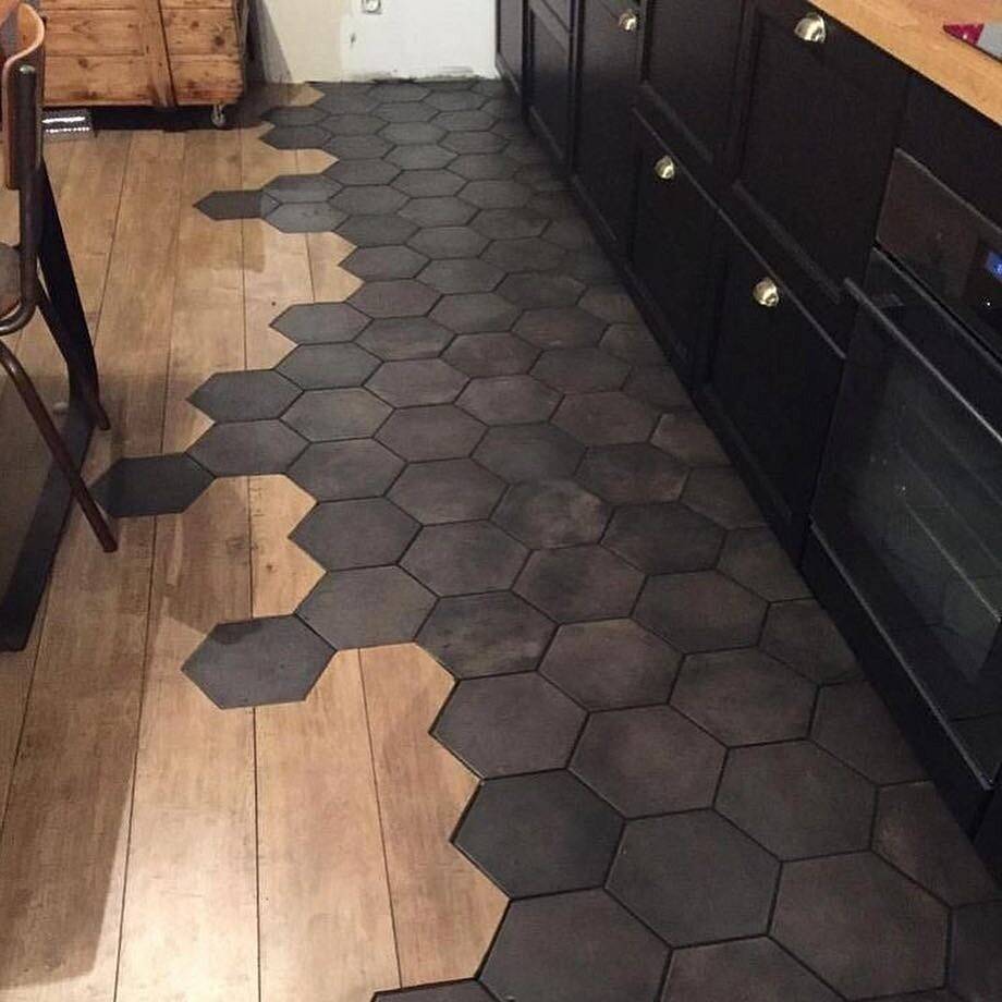 - Стильно и необычно смотрится шестиугольная плитка, особенно в качестве зонирования помещения, поскольку создает уникальный ломаный переход с ламинатом.