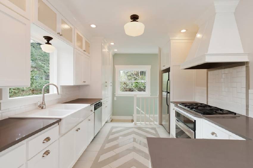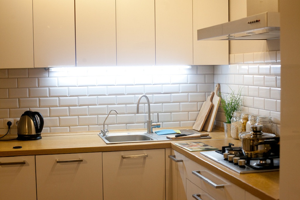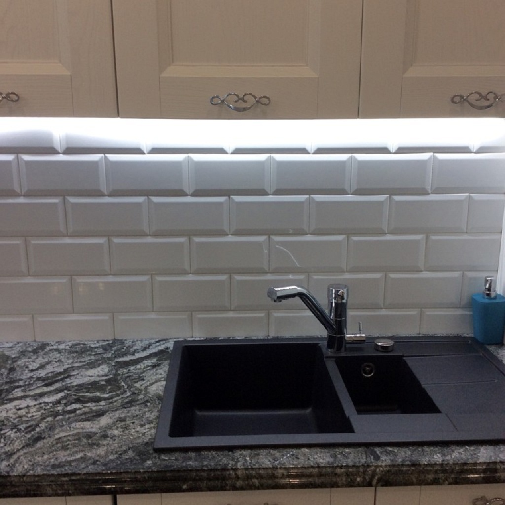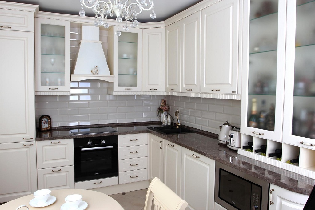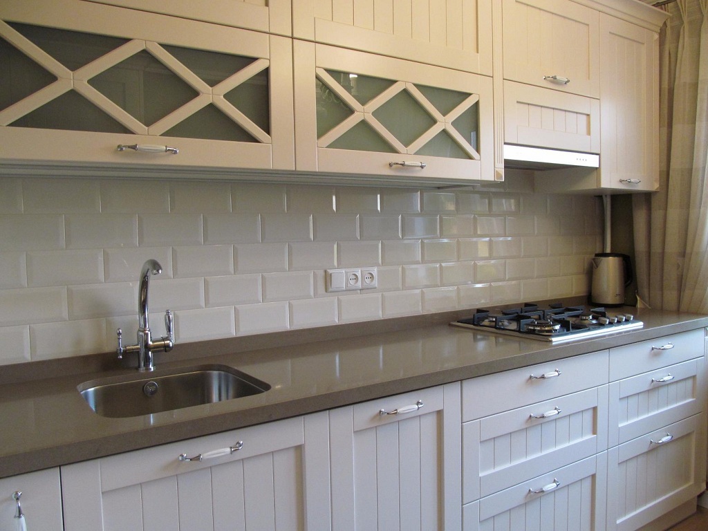 Белая плитка-кабанчик на фартуке кухни, классическое решение