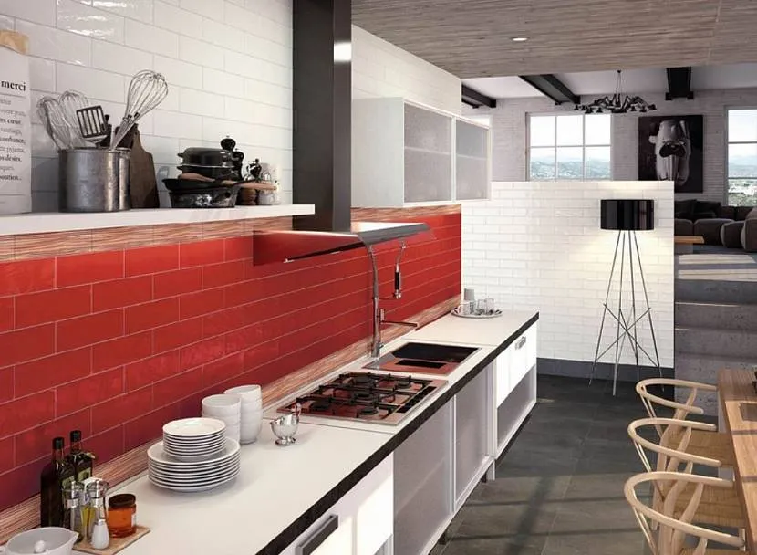 Наиболее часто такую плитку можно встретить в современных стилях кухонного интерьера — лофт, индастриал, модерн, скандинавский, а также в провансе и в кантри. Подбирая кабанчик, нужно ориентироваться на стиль мебели кухни и цветовую гамму интерьера. Плиткой выкладывается не только фартук, можно выложить отдельную стену кабанчиком — ту, около которой находится рабочая зона.