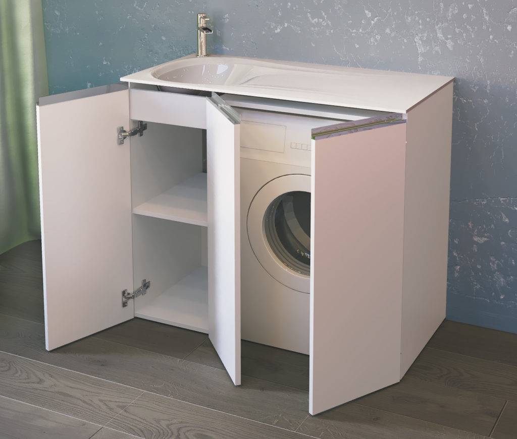 При его выборе нужно понимать, что к высоте выбранной машины нужно будет добавить как минимум 25 см. Это высота раковины и размеры зазора между плоскостями приборов.Несколько сложнее определиться с глубиной прибора. Он должен быть полностью закрыт раковиной, а лучше всего, чтобы чаша выступала за границы стиральной машины в виде небольшого козырька.